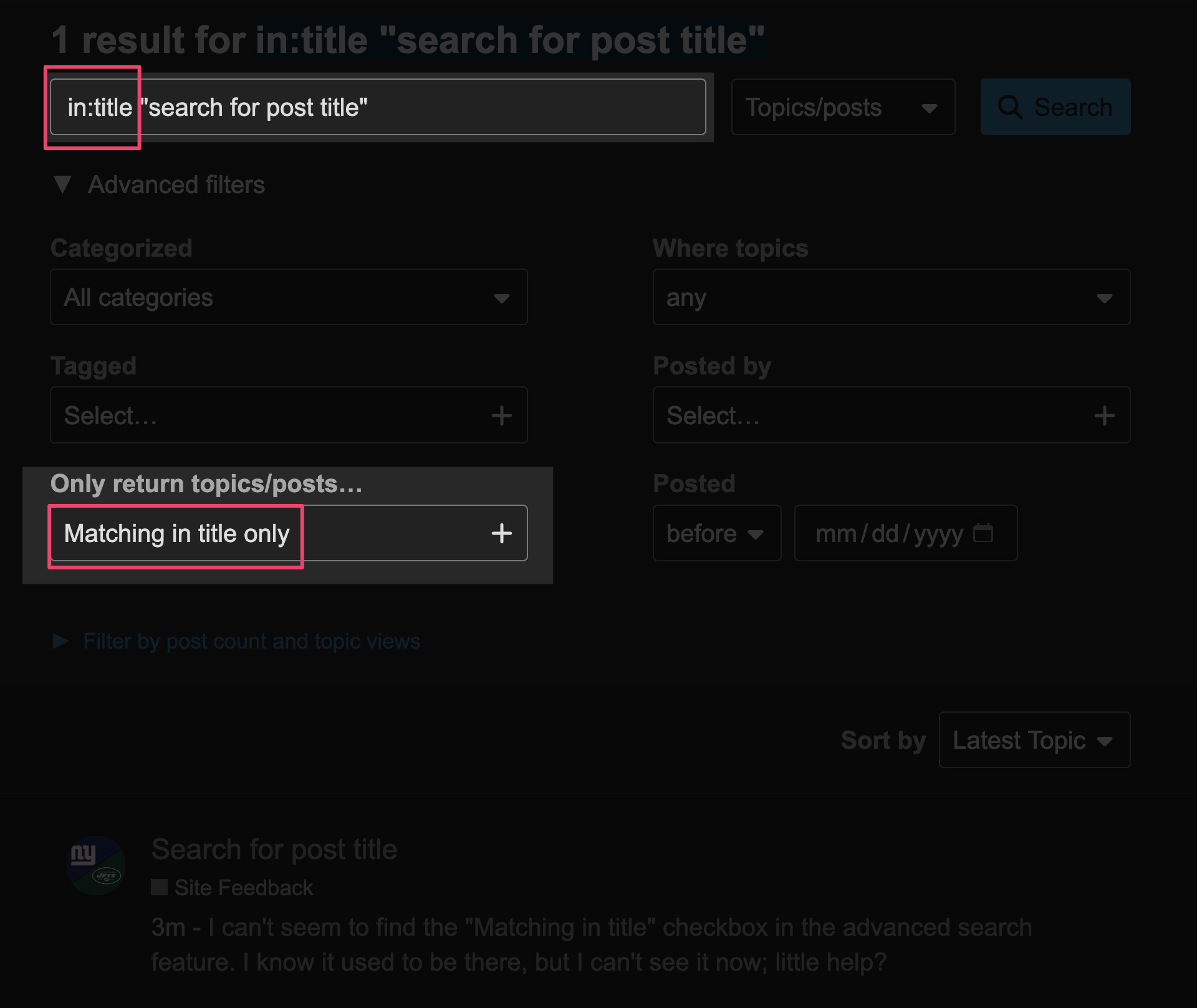 I can’t seem to find the “Matching in title” checkbox in the advanced search feature. I know it used to be there, but I can’t see it now; little help?