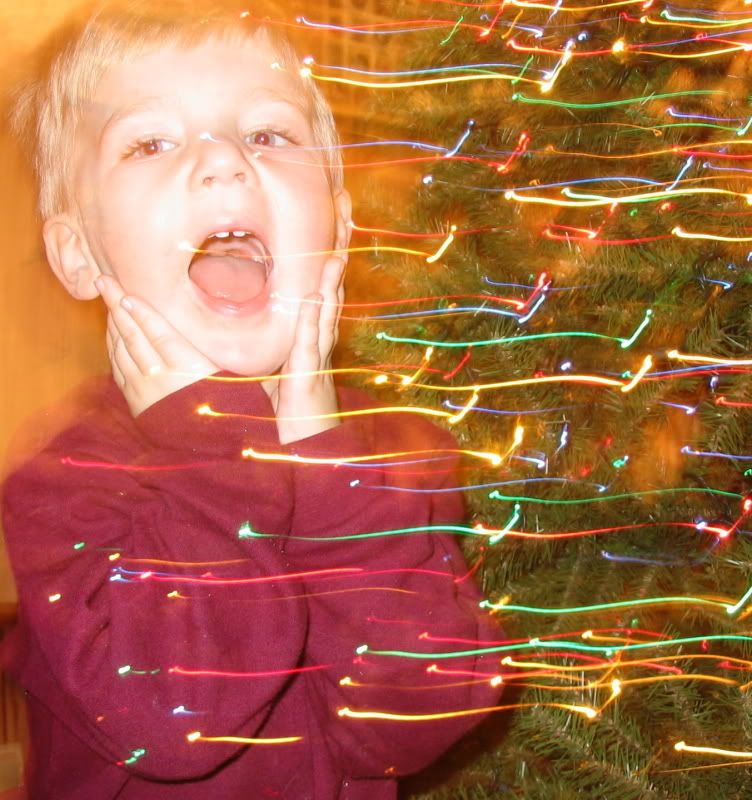 This year it does have colored lights, but I haven’t taken a photo yet. I did get this picture of the tree and boyby accident when we first switched to colored lights. Kind of fun.