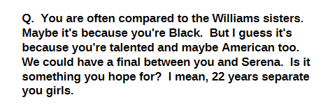 Although political press conferences have some relationship to tennis post-match press conferences, they are quite different. Tennis pressers are usually not confrontational and the atmosphere is much more relaxed. Journalist rarely trot out “gotcha” questions to the players. So while they are both question and answer sessions, they are not that similar.