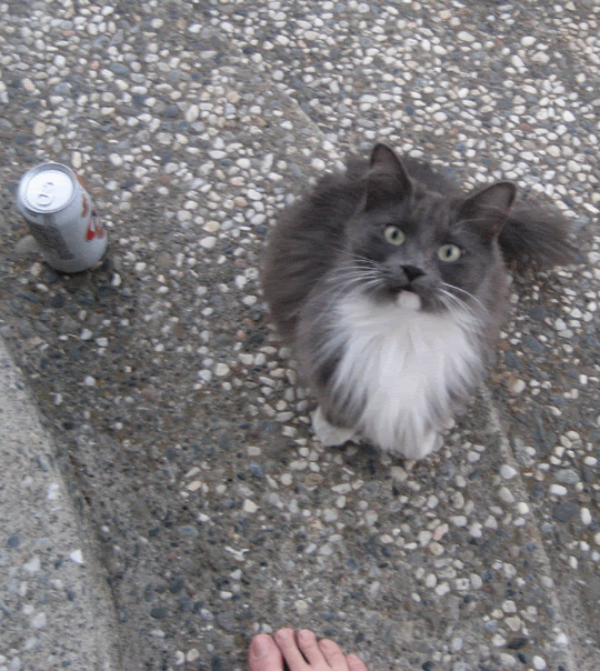 He’s a little stray that ran behind the car one night and I lured out with some chicken. After that chicken we became best friends forever apparently. He’s skitterish around people he doesn’t know and he always hangs around here and scarfs down food like we never feed him, so I think he’s a stray or abandoned.