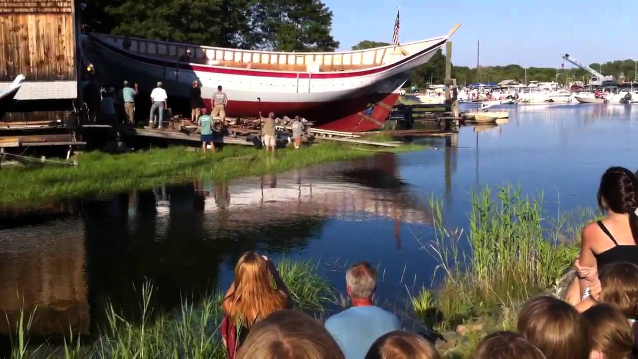 However another possible confusion about early ‘side’ launching is the so called Essex side launch practiced by yards along that river in Massachusetts also back at least as far as the 18th century. In that method the ship is on a launch way perpendicular to shore, but tips sideways as it moves down the ways. See video of a recent one. It’s hard to say if references to pre 19th century side launches refer to something like this method (which the 1751 illustration also might be) or a launch way actually parallel to shore as is generally understood in 19th century-onward meaning of ‘side launch’.