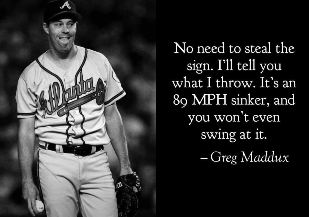 It’s a picture of Greg Maddux that says “No need to steal the sign. I’ll tell you what I throw. It’s an 89MPH sinker, and you won’t even swing at it.”
