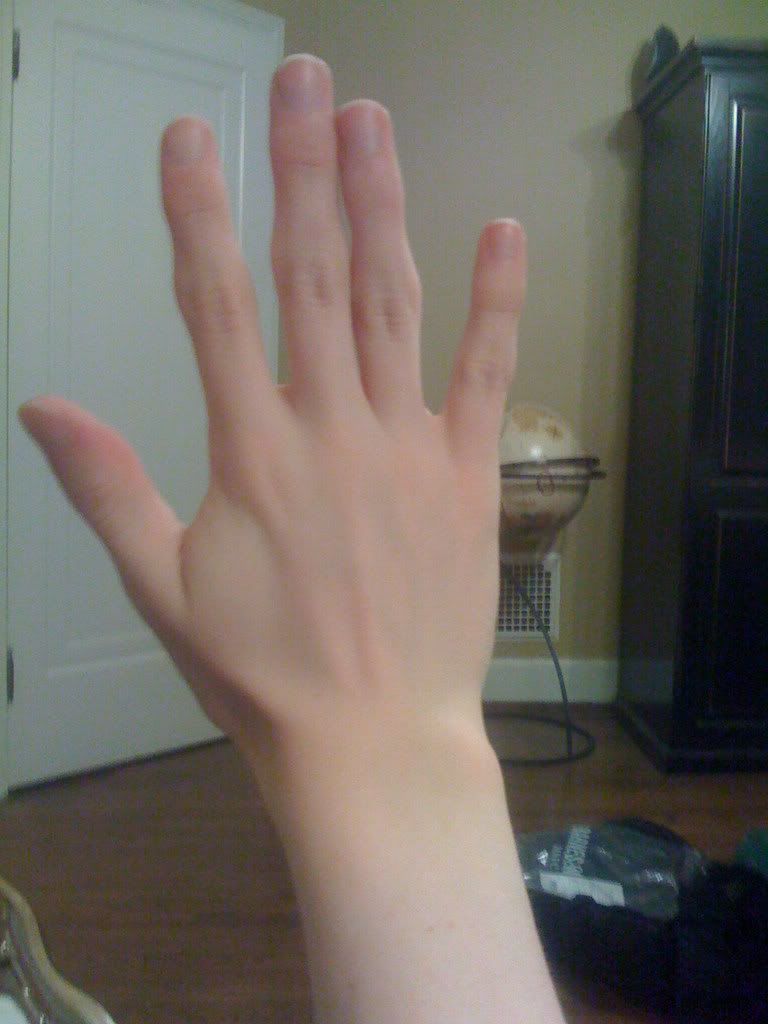 At the opposite end of the spectrum, what about these? I do need to cut them soon, but I don’t think they’re that bad. And for what it’s worth, it would squick me out to have fingernails that short, and I’ve never bitten them (I don’t really understand how the process works, actually). I’ve also started a new pattern of cutting them (with clippers): I cut the middle first down to the start of the white area, then I cut the sides diagonally down to the edge of the nail, giving flat nails on top with sloping sides. Also, it looks like I have proportionally much longer fingers than you.