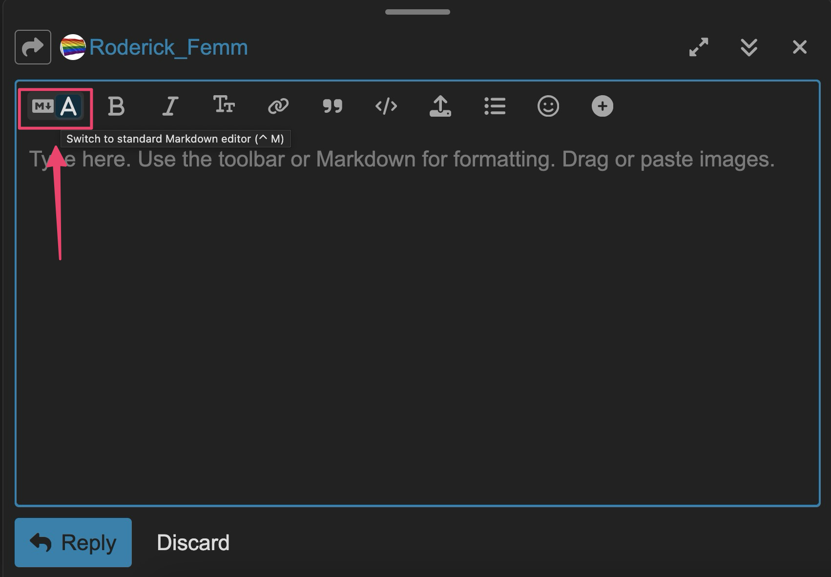 How a post looks after it’s posted depends on your theme (like I have dark mode on in mine), but while you’re composing a post, the editor mode is just a toggle you can switch between with a button. (See above.)