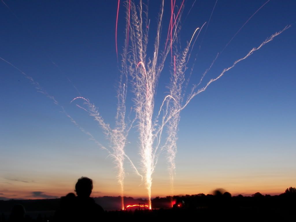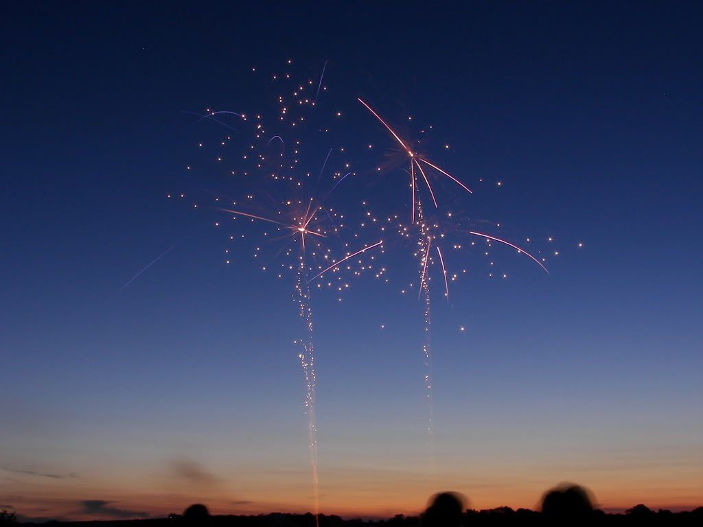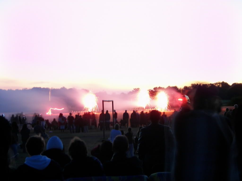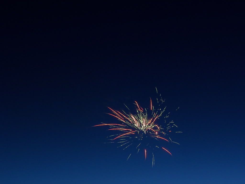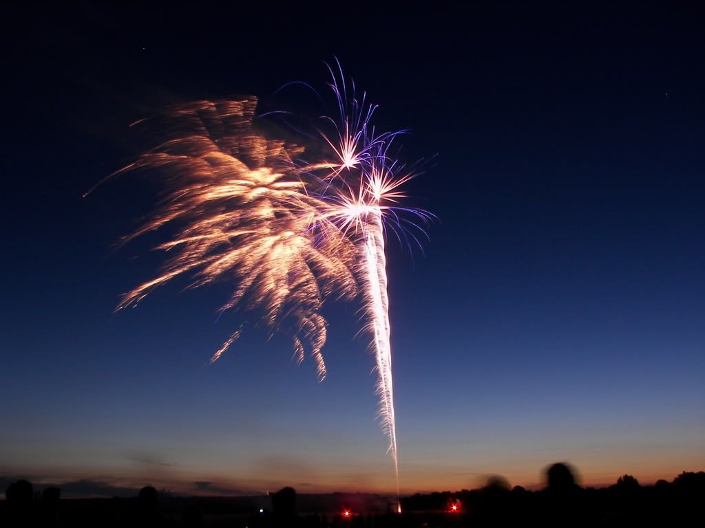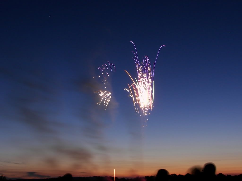 So fed, we headed out to the local fireworks show that was to begin when it got dark enough. It was held at the Brampton Christian School, right on the border of Brampton and Caledon off Highway 10, just a short three minute jaunt from the house. The parking situation was impressive; there were obviously plenty of people in attendance as every bit of real estate in the parking lot proper and the grassy areas to the side of the school and portables was occupied by cars. We found a spot, parked, and walked into the huge field behind the school whereupon the festivities were taking place. There was a cool stage set up where a band had played earlier in the day. They were done and packing up by the time we got there, so I don’t know who was playing. The setup was nice, though. I set up my tripod (unfortunately about 30 feet from one of the speaker stacks). Very shortly after doing so, a series of Roman Candles signaled the beginning of the start of the show. The accompanying music started up – a kind of new age orchestral piece, would have been very nice if it wasn’t blasting directly into my eardrums. But anyway, I started shooting: