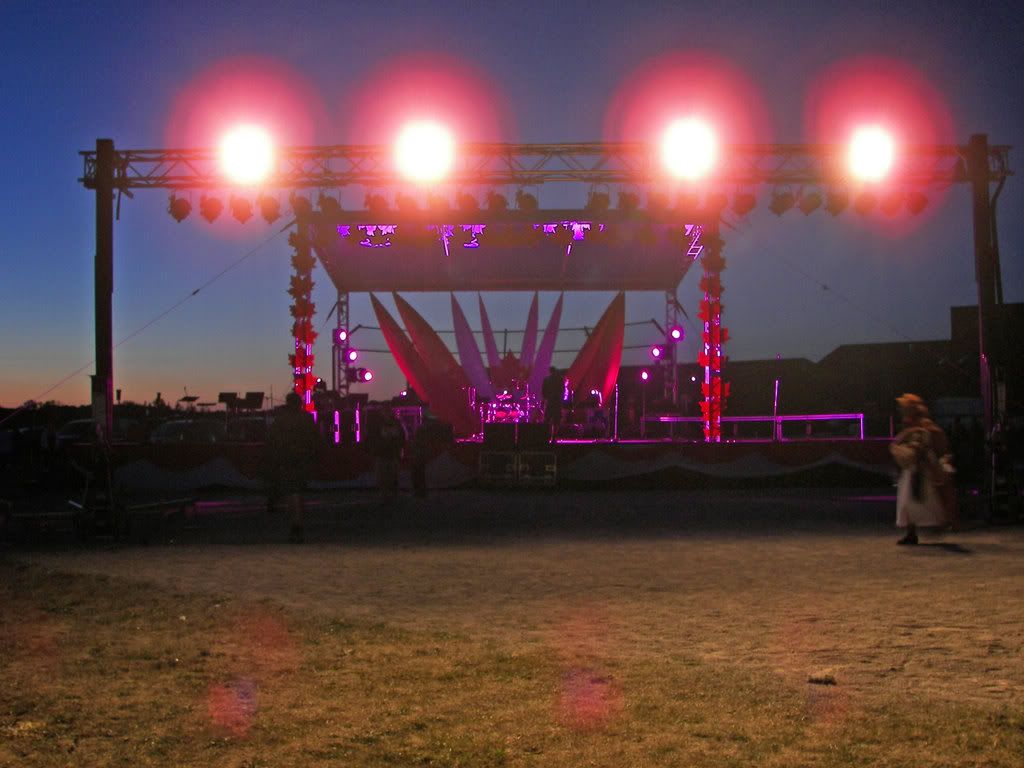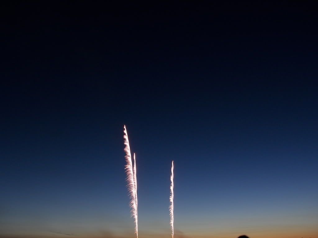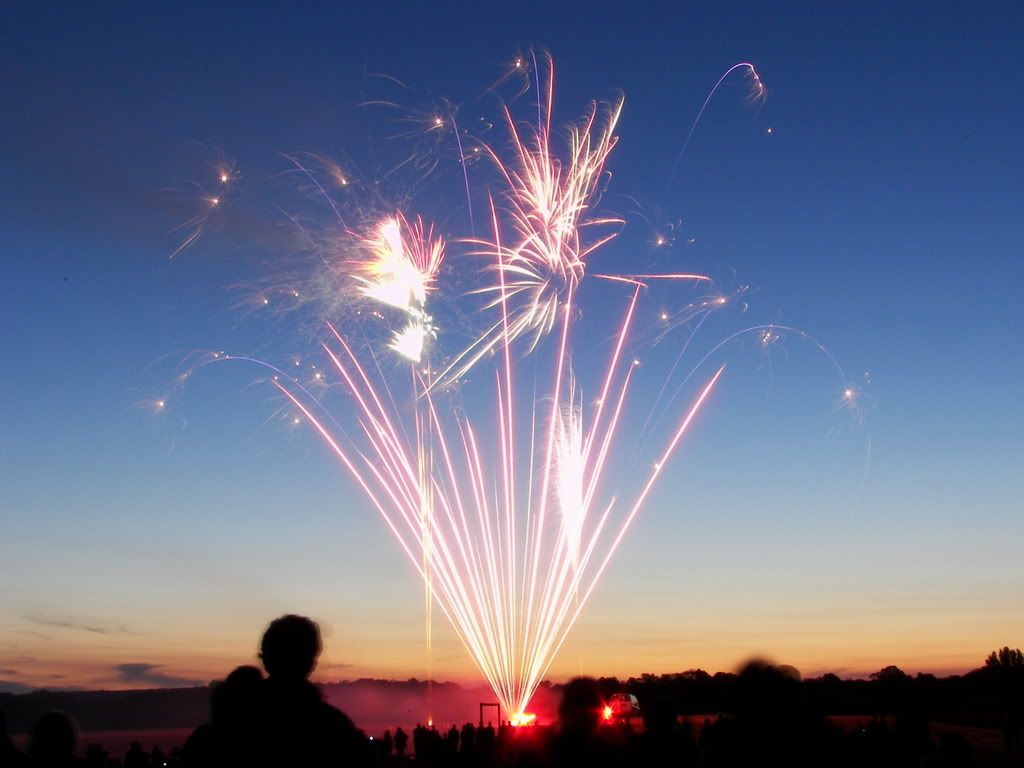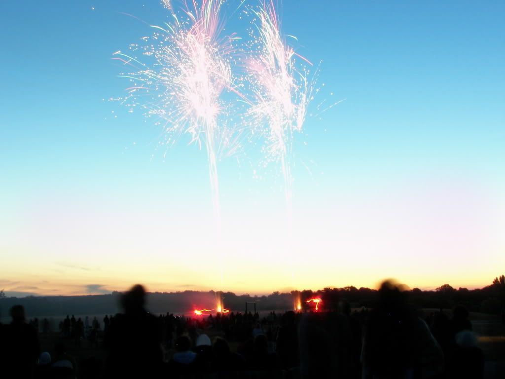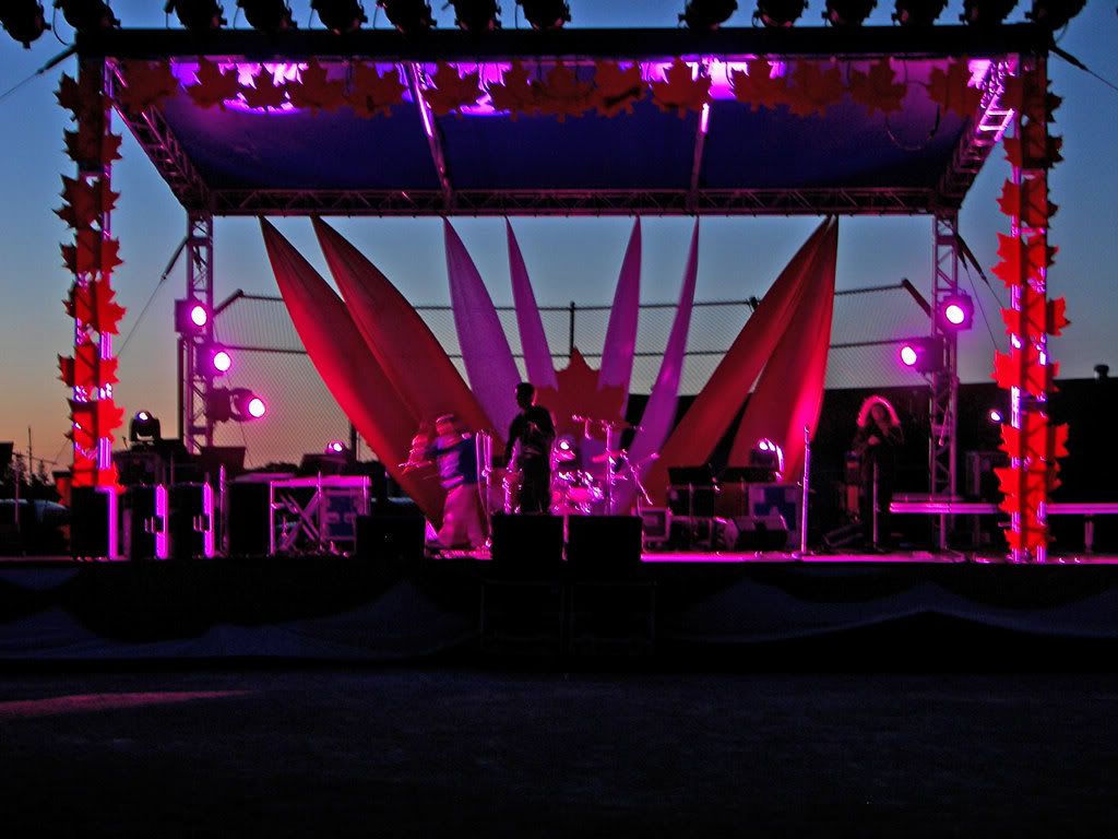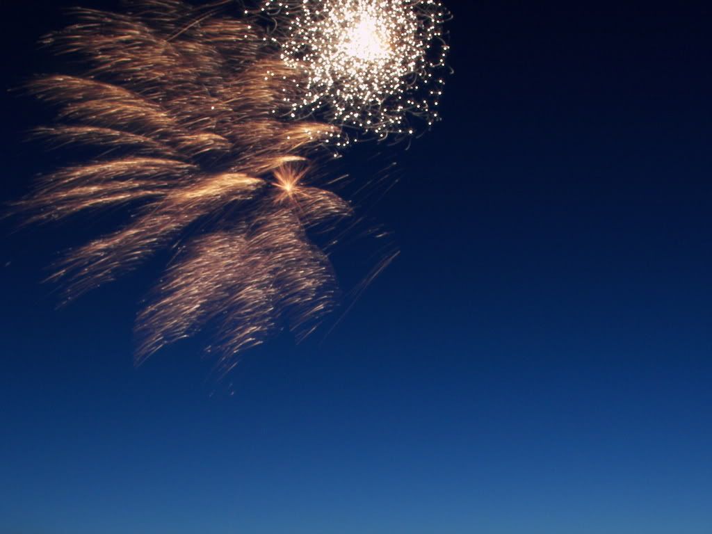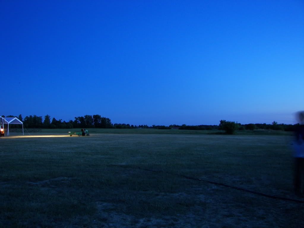 So fed, we headed out to the local fireworks show that was to begin when it got dark enough. It was held at the Brampton Christian School, right on the border of Brampton and Caledon off Highway 10, just a short three minute jaunt from the house. The parking situation was impressive; there were obviously plenty of people in attendance as every bit of real estate in the parking lot proper and the grassy areas to the side of the school and portables was occupied by cars. We found a spot, parked, and walked into the huge field behind the school whereupon the festivities were taking place. There was a cool stage set up where a band had played earlier in the day. They were done and packing up by the time we got there, so I don’t know who was playing. The setup was nice, though. I set up my tripod (unfortunately about 30 feet from one of the speaker stacks). Very shortly after doing so, a series of Roman Candles signaled the beginning of the start of the show. The accompanying music started up – a kind of new age orchestral piece, would have been very nice if it wasn’t blasting directly into my eardrums. But anyway, I started shooting: