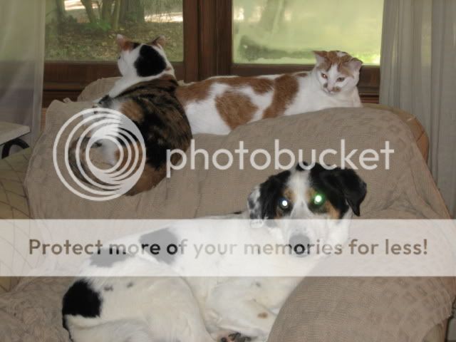 Auggie, the doggie (when it rains he gets all soggy), Snickers (the calico), and Biscuit (the buff and white). They are the best furkids ever.