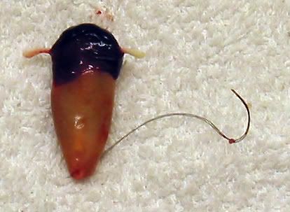 I know you’re all dying to see, so on with the pictures! I got one good shot of the first side with no flash, and the best shot of the other side was with the flash, so the brightness is a little different, and the second shot is kind of washed out, but I think you’ll be able to perceive all its slimy glory.