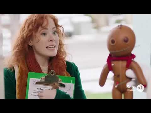 A redhead girl at a door asking a man to sign her petition to make everyone smell her farts. Suddenly Santa Claus appears and curses the girl with a voodoo doll.