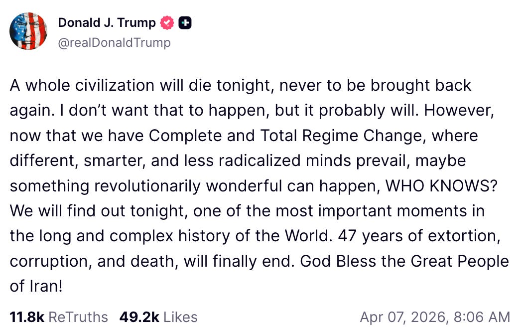 Not from Trump, the man is nothing if not a serial exaggerator, he is totally capable of bombing some infrastructure and then declaring that the whole Iranian civilization has stopped existing.