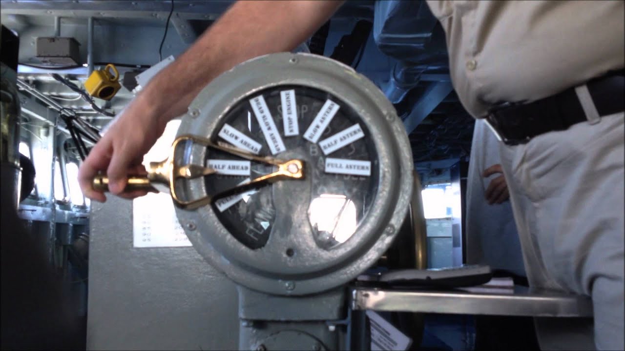 “All stop”, as pointed out upthread, is just a command to stop the engines. A real ship will slow to a halt due to friction with the surrounding water. So, if they want the ship to “stop”, then the Captain says “all stop.” The “all stop” command is based on the old “engine order telegraph” (EOT), which was a way to communicate engine commands from the bridge down to the engine room. The EOT had several positions on the dial, typically something like Full Ahead, Half Ahead, Slow Ahead, Stop, Slow Astern, Half Astern, Full Astern. You would have a separate EOT for each engine, so when the captain ordered “all stop”, someone on the bridge would rotate the dials for all engine EOTs to the “stop” position and would ring the bells indicating a change. The guys down in the engine room would hear the bells and would look up to the dials to see how the bridge wanted the engines to be set, and would follow the orders accordingly. On many EOTs, just moving the dial would ring the bells, so you’ll often see them move the dial all the way to either end (basically to ring the bells to get the engine room’s attention) and then they’ll move the EOT’s handle to the actual engine speed they want. The engine room will often acknowledge the order by moving their dial to the same position, which moves an indicator on the bridge’s EOT.