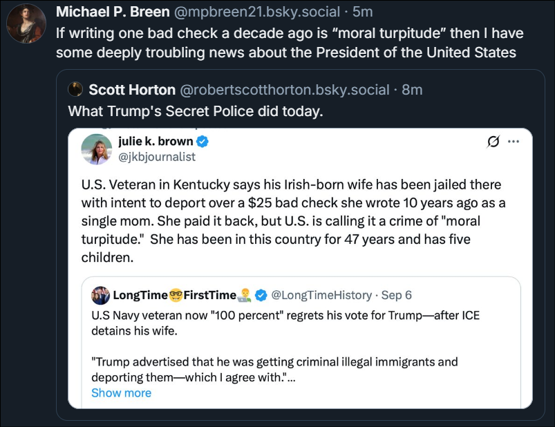 Irish grandmother who’s lived in the US for more than 40 years is in custody because of a $25 bad check 10 years ago; she and her husband voted for Trump. I say fry ‘em both.