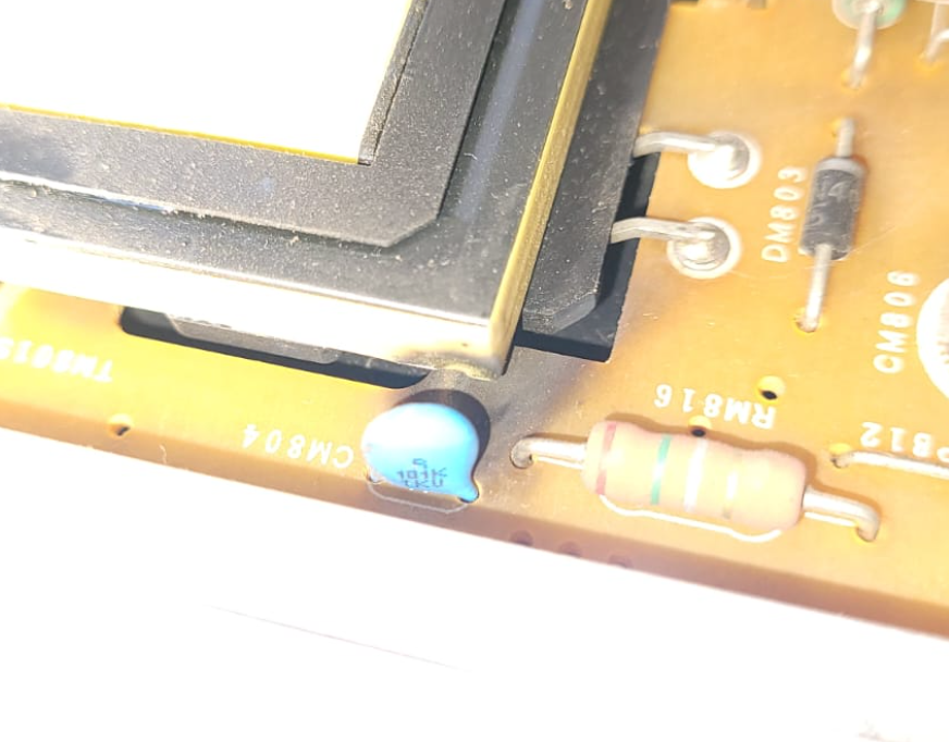 Here a pic of the power-board (note the red arrow pointing to the blue cap):