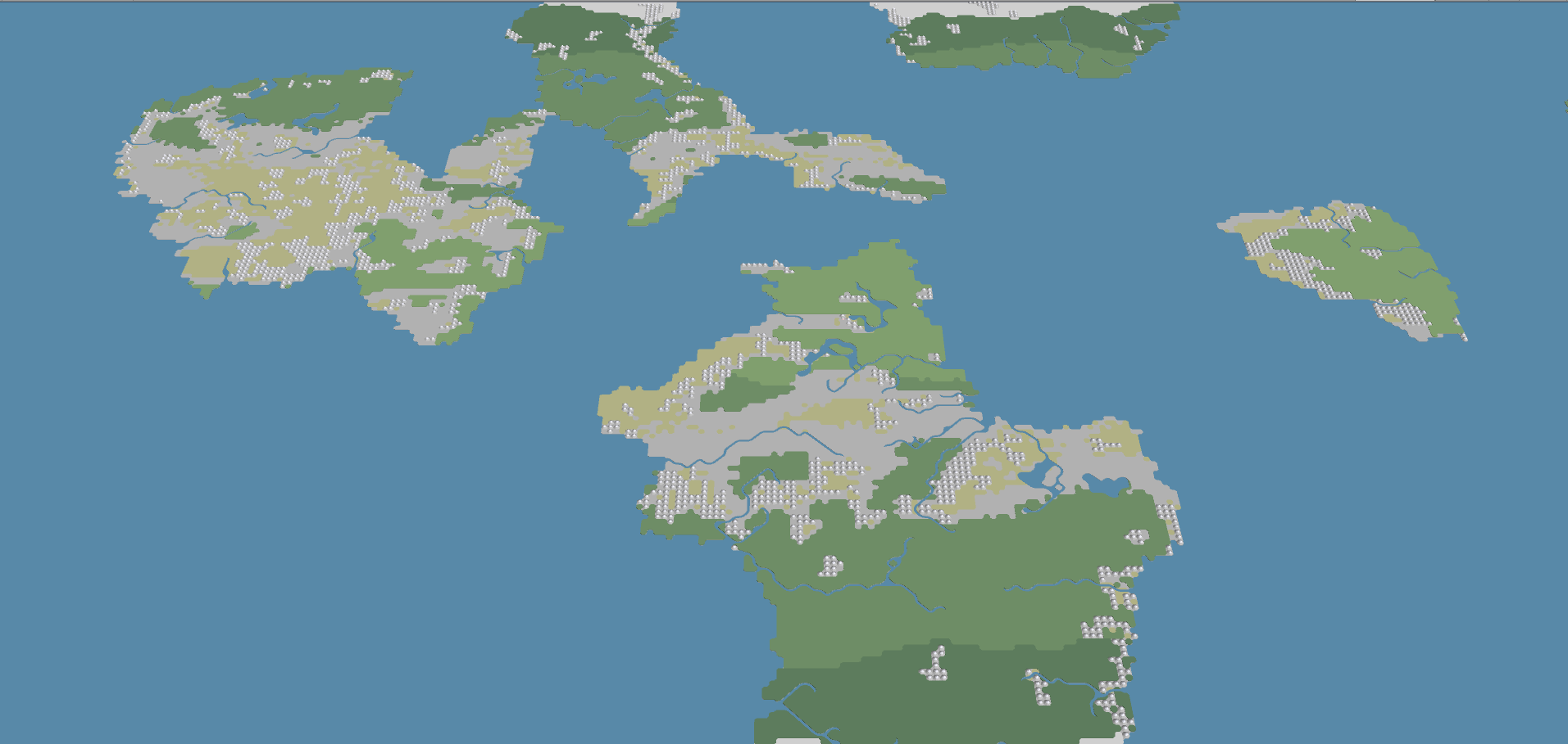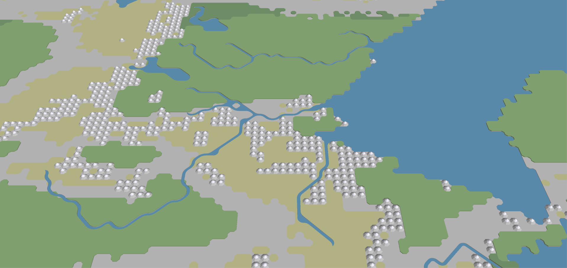 I’m currently coding my own civilization game in Unity. I wanted a civ game that was more sim-like – sort of like a SimCity that spans 6000 years and covers the entire globe. Since I’m a better designer/coder than artist it’s entirely procedural. No models, no textures – just algorithmically-generated polygons. Terrain is generated using a simple plate tectonics simulation, with a simple global climate model to assign biomes. Here are a couple of screenshots.