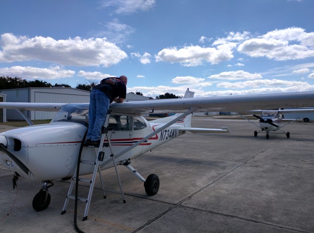 At smaller airports, refueling of general aviation aircraft is generally done self-service at a fixed-base fueling station rather than via a tanker truck. There is always a reel of grounding wire along side the gas tank that the pilot must attach to the airplane before fueling. It’s visible at the lower-left corner of this photo: