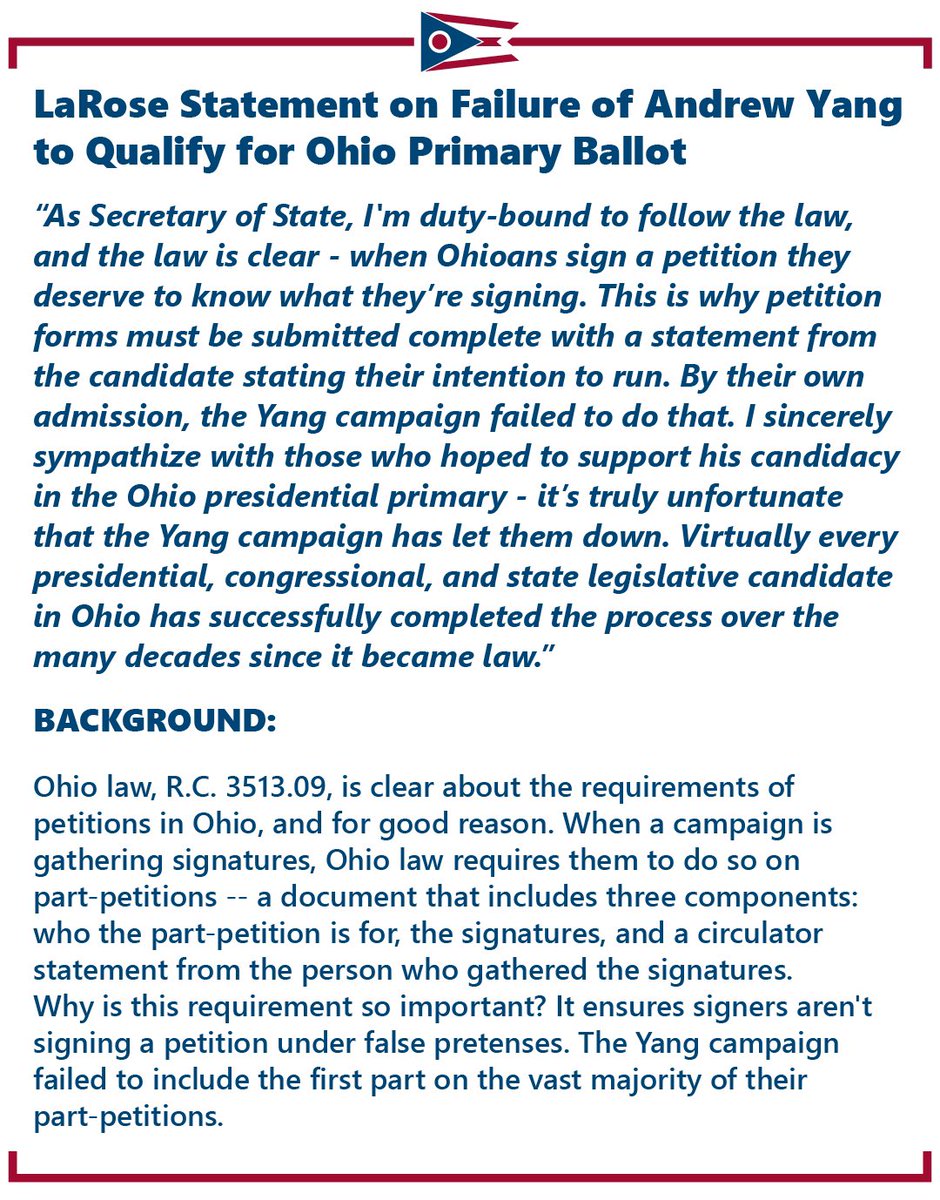 Yang’s response, in part: "“My campaign submitted nearly three times the amount of signatures needed, virtually ensuring I would be on the ballot in Ohio. Nevertheless, because of a bureaucratic paperwork issue caused by an awkwardly-worded law, nearly 3,000 Ohioans’ First Amendment rights have been denied. As a non-politician, it’s unfathomable that this could happen…”