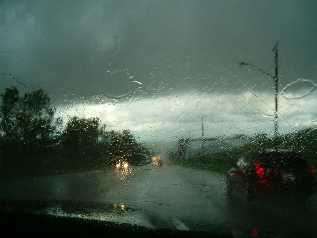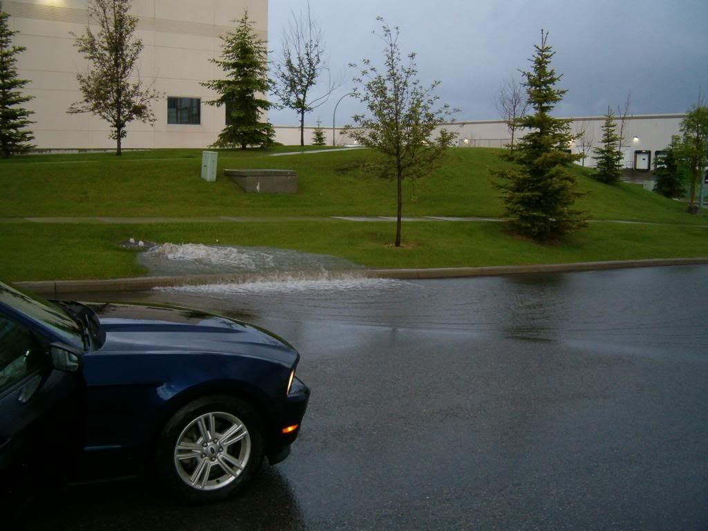 A manhole gushing water after yet another downpour (with bonus Mustang!). ![]()