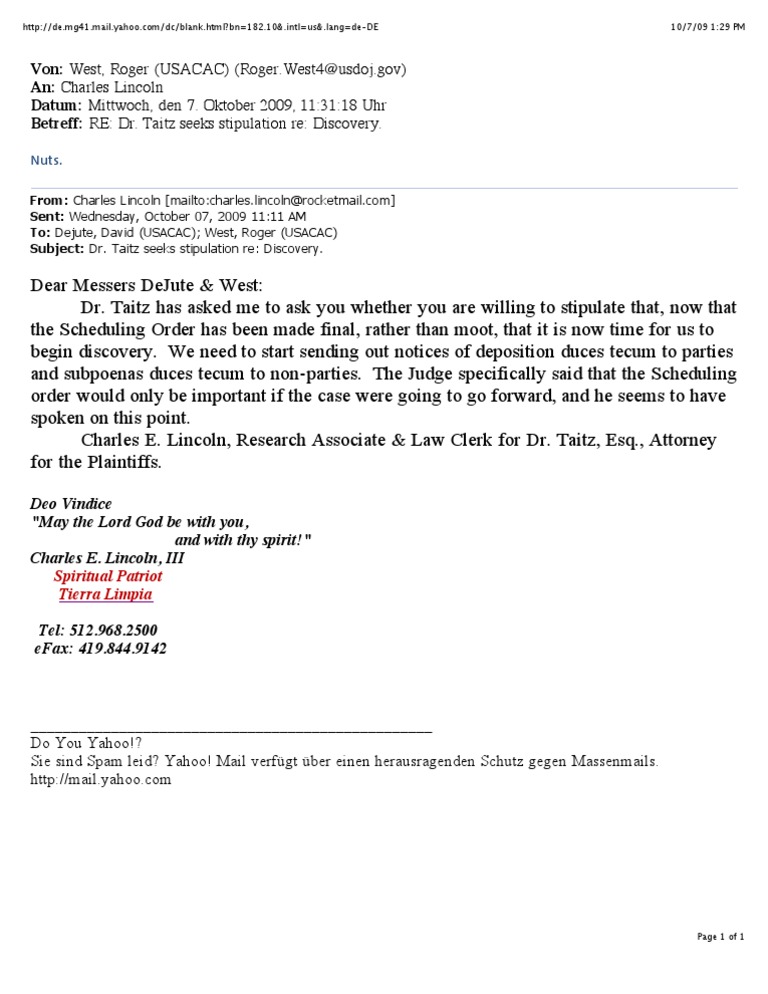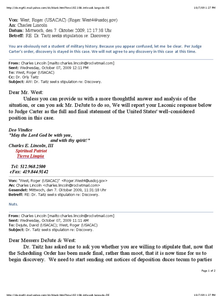 This email exchange discusses a request for discovery in a legal case. A lawyer representing the plaintiffs, Charles Lincoln, asks the US government lawyers if they will agree to begin the discovery process now that the judge's scheduling order is...