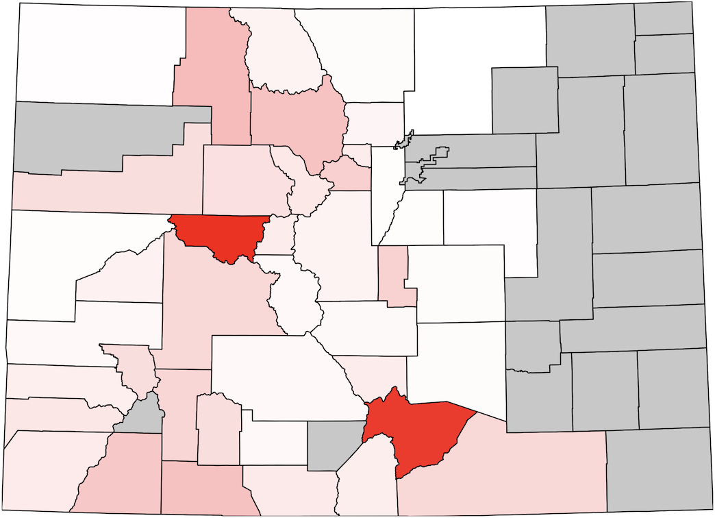 Here I have created a map indexing bear sightings to county population, which Discourse will not allow me to embed, naturally. Pitkin and Huerfano counties are the most active, at 0.015 and 0.014 sightings per person, respectively. The average for counties that reported any bear sightings at all is 0.00059 per person. That does not include the 22 counties, covering 36% of the state’s population, that did not report any sightings, including Denver, Arapahoe, Adams, and Broomfield counties.