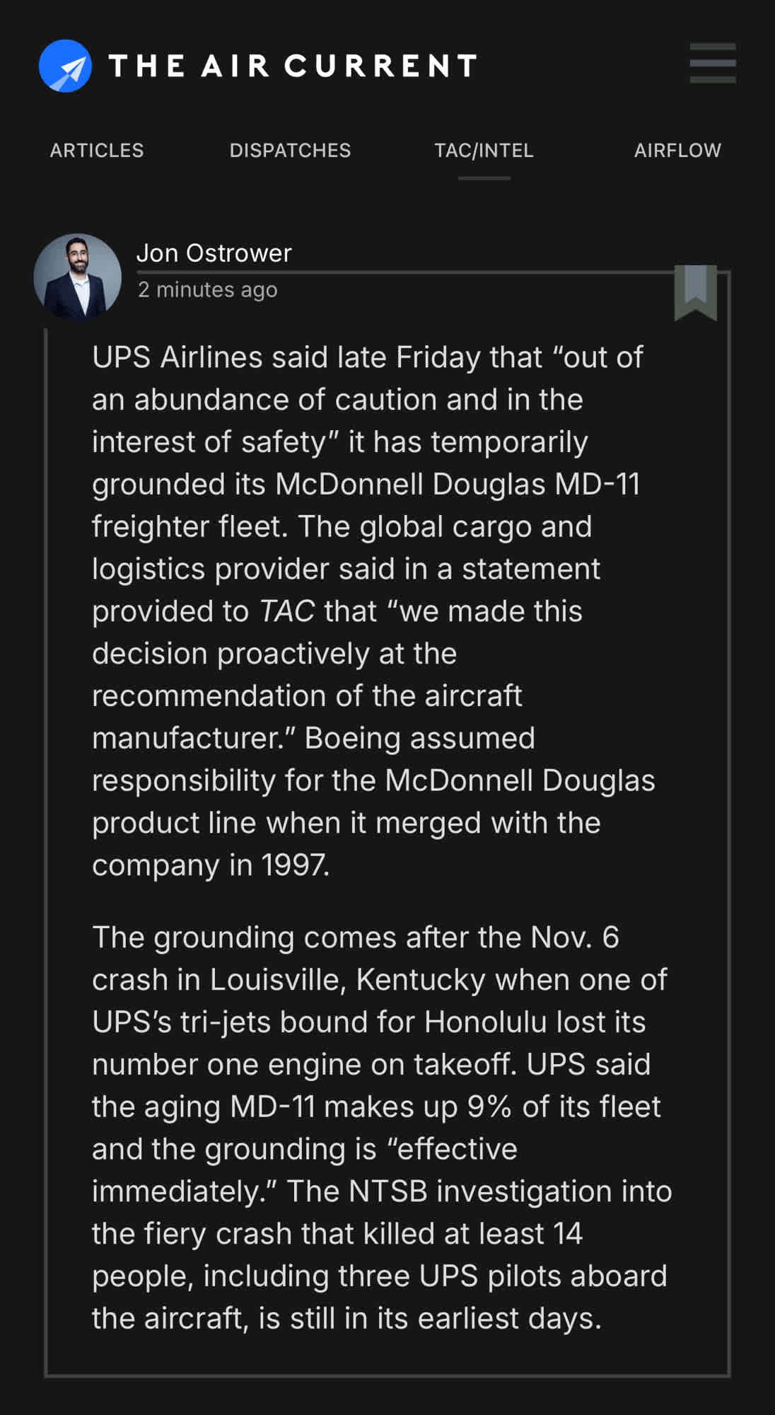 I’m wondering about UPS Flight 2976, the cargo plane that crashed in Louisville, killing at least fourteen people. Apparently the left engine detached prior to or during takeoff and there were flames on that wing. So was the flight crew aware of this? Were they beyond the point that they could abort the takeoff? Did they call a mayday?