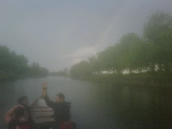 It’s down a canal and back, though, so not much variety. I circle around one bridge’s supports and come back. I’d love to paddle regularly on a lake, but for now I just use the equipment available at my dragon boat club’s site. Here’s a picture of a nearly empty boat (rescheduled practice time that worked for no one!) and a rainbow. That was the first time I steered. I think I may have posted this here before! It’s a really pretty a peaceful place to be. It’s also rather narrow, so a great place to learn to turn!