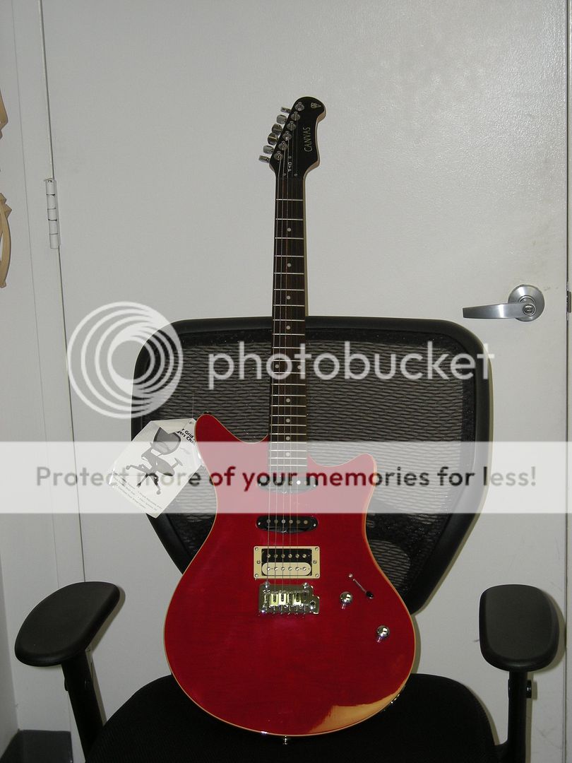 It’s a Canvas CTF20. Perfectly bookmatched flamed top. Two point trem, which is interesting. Little heavy, but very comfortable. Not sure how best to describe it. Offset double-cutaway? It’s got a 15 or so degree neck angle, no string trees, no dip and curve like a Fender.