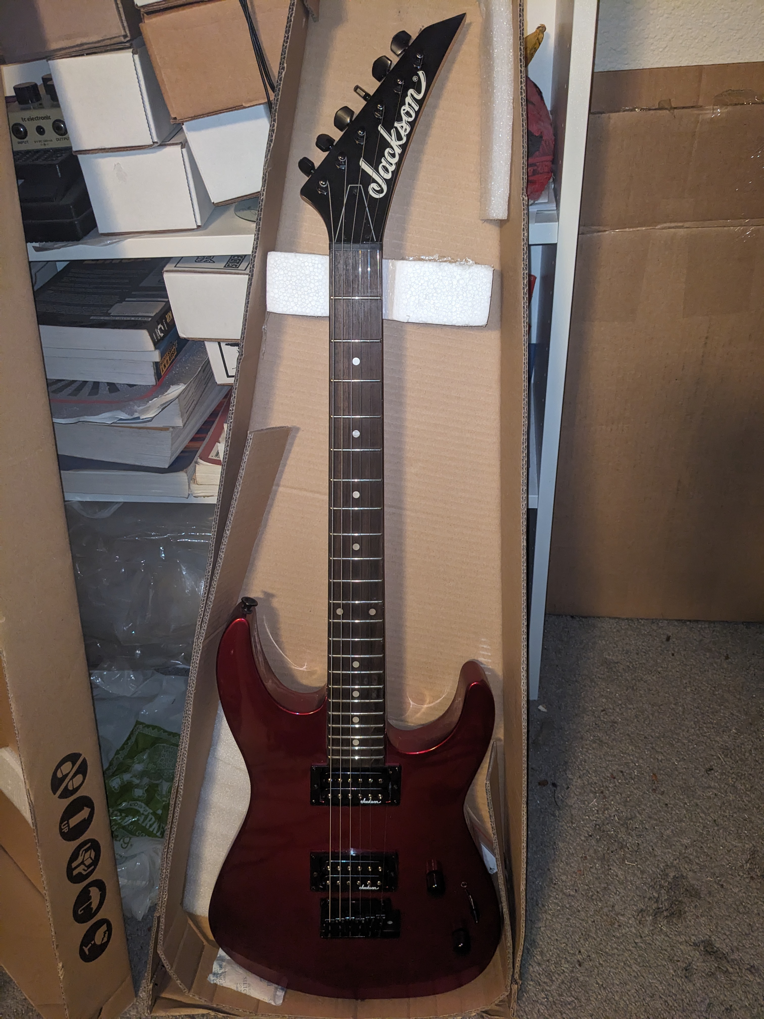 Sure enough, I did win it. Oddly, I have 20 something guitars, but I’ve never had an actual functioning super-strat. I have two that started life as one, but their poor necks were abused beyond anything besides a complete replacement before they were mine. So they got set up for slide guitar, and that’s what they’ve been used for. So this is probably my real first long-term relationship with one of the major “Flavors” of guitars. I almost certainly wouldn’t have bought it for myself, and I’m likely to loan it out, but I very well think I may keep it. If nothing else, it is pretty.