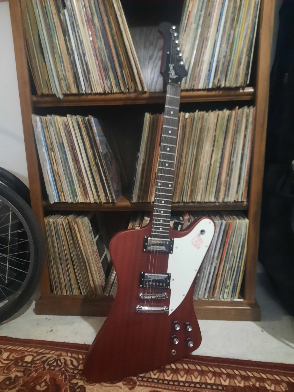 Well, a friend of mine decided he wants to sell one of his guitars so he could finance buying another guitar. I asked about which ones he was considering selling, and an Epiphone Firebird was one of them. It’s one of the set neck ones, not through neck. And it’s got regular humbuckers instead of mini humbuckers, but it seems pretty sweet nonetheless. He put a Gibson truss rod cover on it, though. Silly, but I guess I understand. ![]()