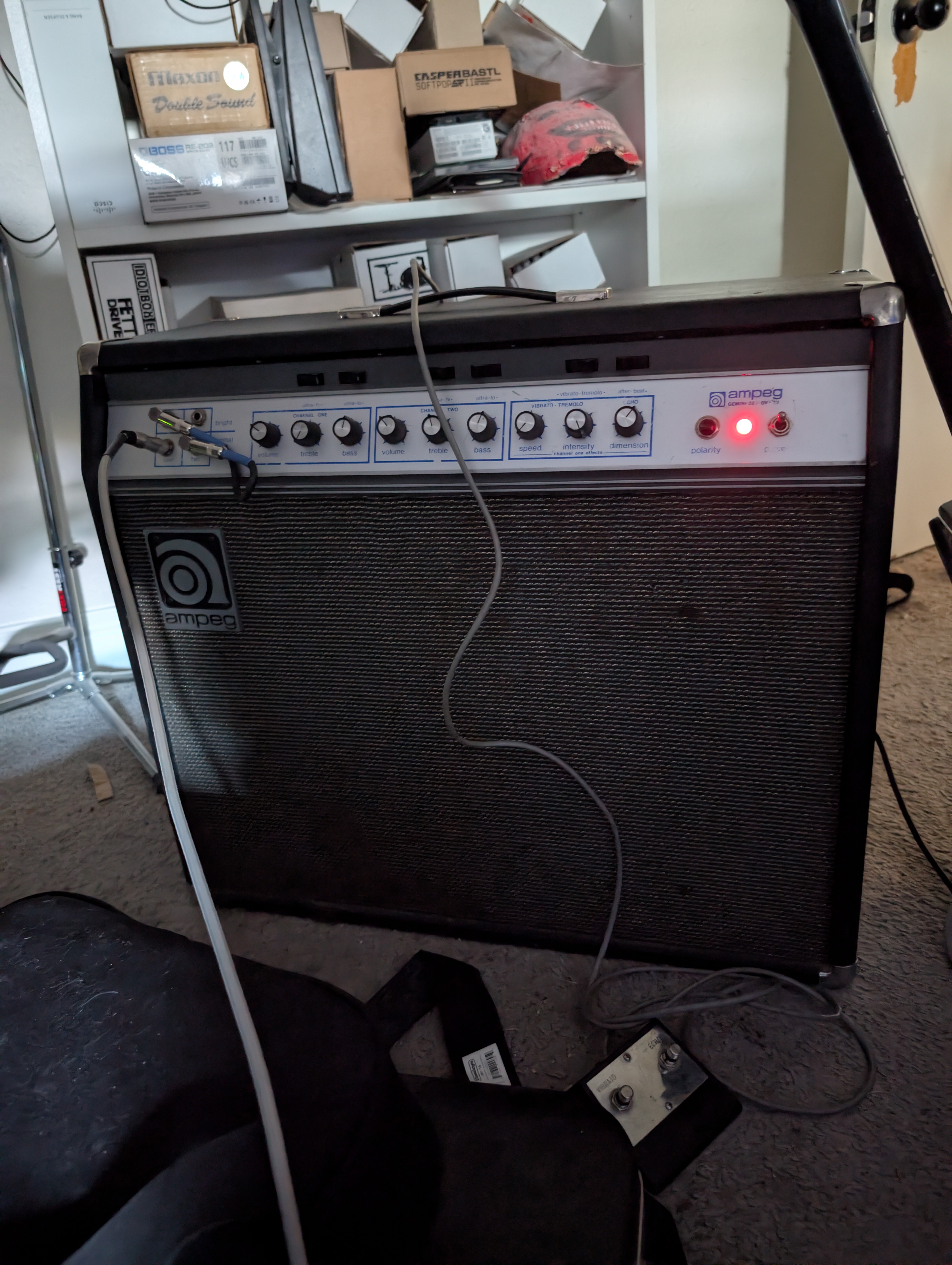 Well, I didn’t really lose my mind this time, but I did go ahead and buy my ex-roommate’s very heavy and not very loud Ampeg Gemini II GV-22 35-40W 2x12 combo. Its tremolo isn’t awesome until you hit the after-beat switch. But its vibrato and reverb are to die for.