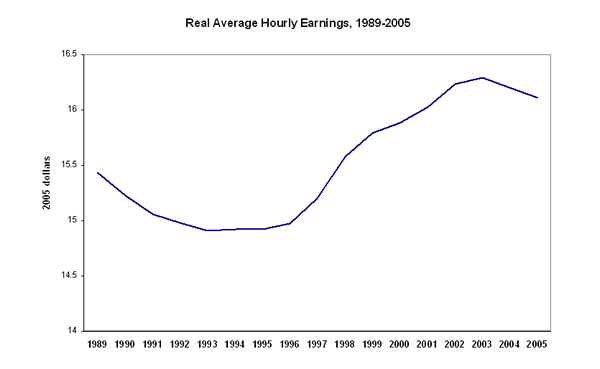 This chart from EPI shows a raise in real hourly wages of $0.50 ($15.50 up to $16/hr) from 1989-2005.