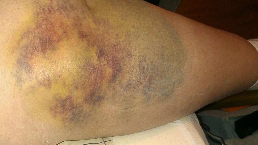 And, Scones!, geeze, I think you stole my award for purplest appendage ever. Good grief, lady, if you haven’t got any arnica gel, go get some. It makes the bruises heal faster. Or, at least the color fade more quickly, so you stop freaking us out.