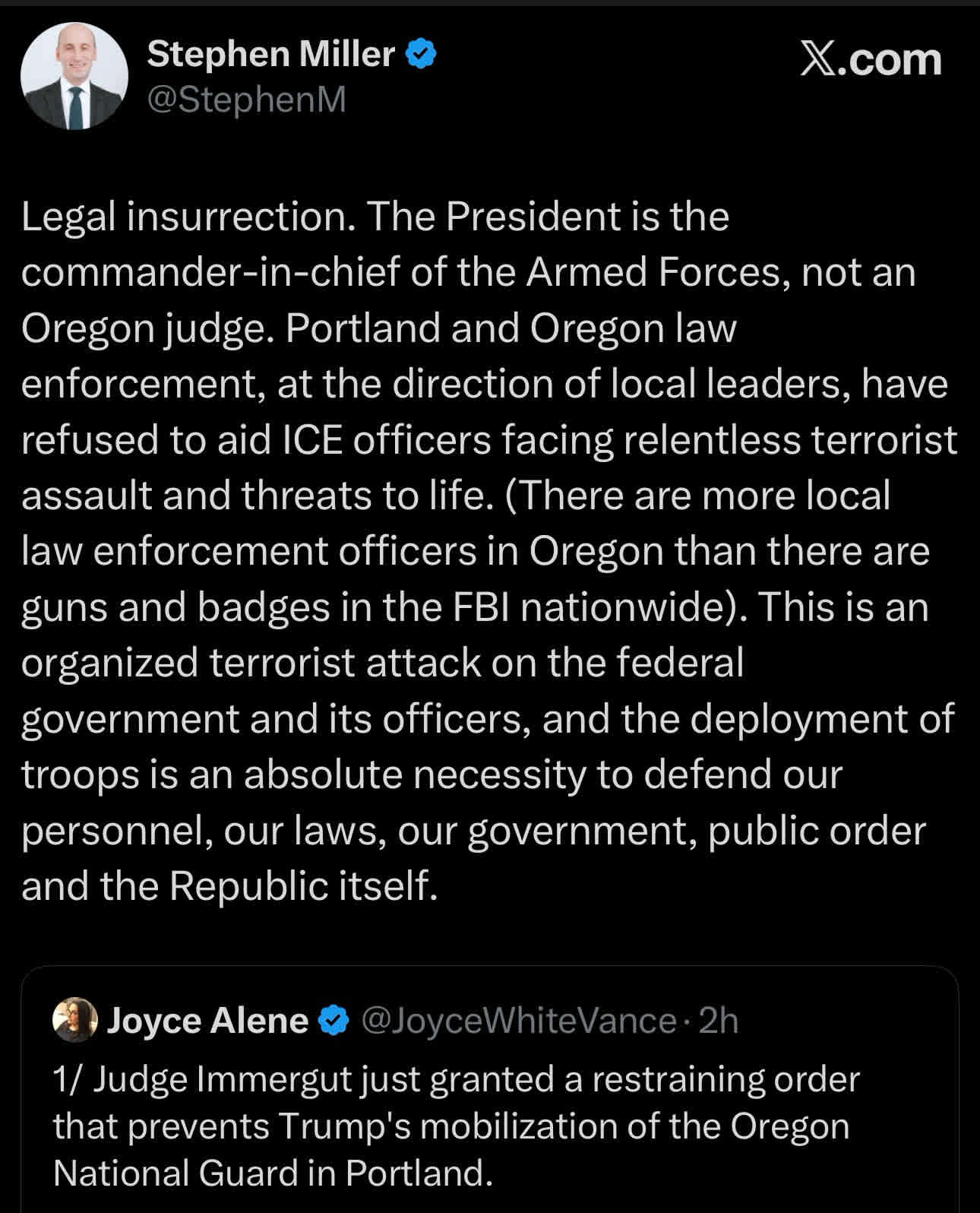 Stephen Miller pissing himself over Judge’s order temporarily baring deployment of national guard troops to Portland.