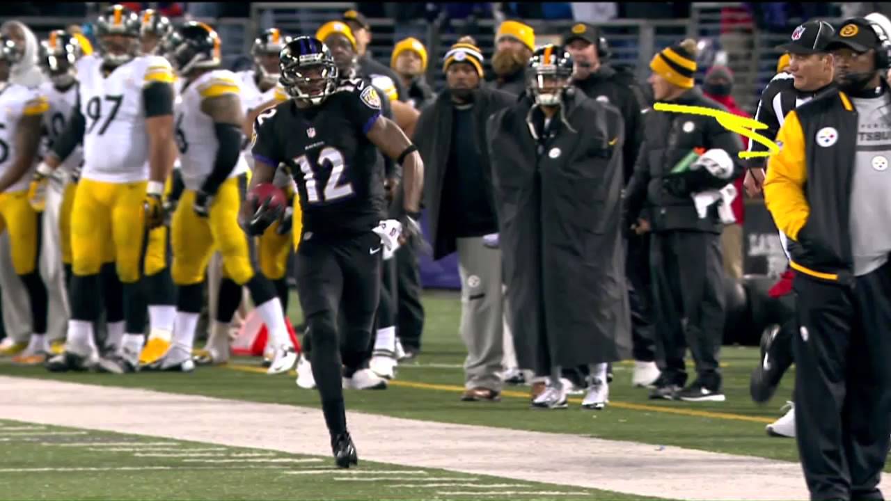 Not only is Tomlin standing on the field when he shouldn’t be, but he is also very clearly not looking at the play taking place on the field! (To be fair, he may have been trying to watch the play on the Jumbotron.)