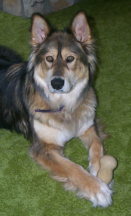 She supplements her diet from the compost heap and garden–she’s a total fiend for fruits and veggies. No tomato plant is safe from her, pumpkins, canteloupe and melons are favorite treats, she’ll eat raw basil leaves, cucumbers, broccoli, zucchini, apples, pears, peaches, almost anything. I’ve had to stop composting onions and grapes because I can’t keep her out of it, and I’ve heard neither are good for dogs. Once in a while she gets a giant beef knuckle bone I pick up from a local butcher and roast in a low oven for an hour or two–she can crunch those bones right down to nothing, it’s a scary sight.