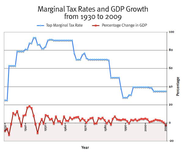 Regardless of the abuse of statistics and bias in this article, one can still see that the tax increases caused economic “growth” to plummet during the tax increases of the 30’s to 40’s and 40’s to 50’s, and that the “growth” went upward during the later tax cuts. If the graph were not attempting to minimize the effect by graphing a derivative against a linear function, it would actually make my point.