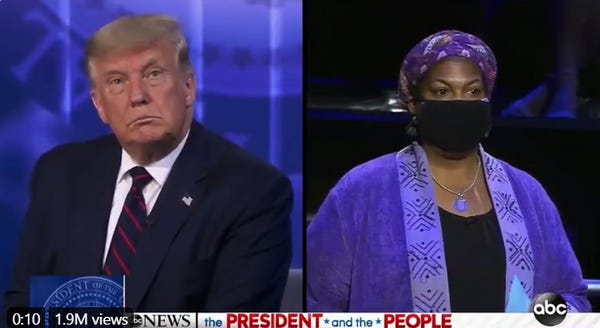 Then, in response to a voter question, Trump blamed Joe Biden for not imposing a national mask mandate…