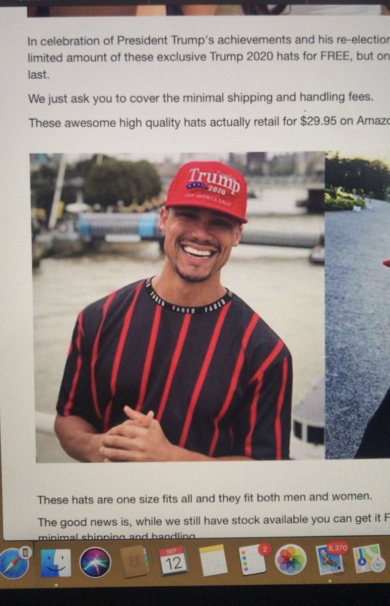 His campaign photoshopped a Trump 2020 hat onto a private photo of a British reality tv figure for their online store.