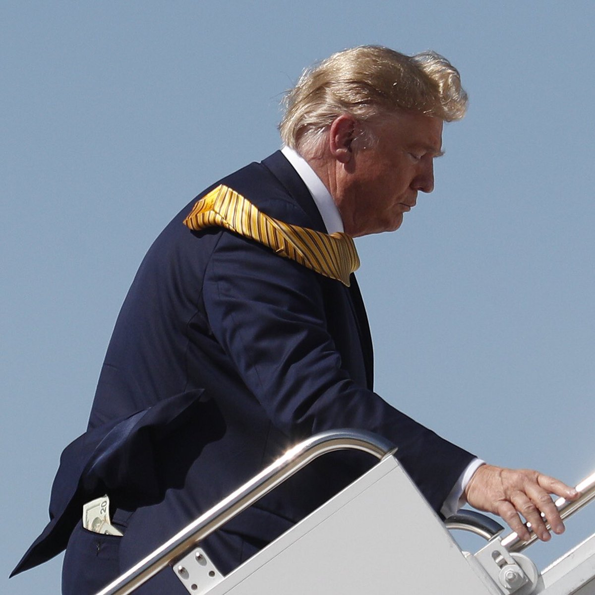 Photo of Individual 1 getting on bard Air Force One with money falling out of his pocket.