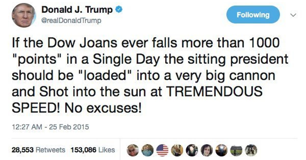 *If the Dow ever falls more than 1000 “points” in a Single Day the sitting president should be “loaded” into a very big cannon and Shot into the sun at TREMENDOUS SPEED! No excuses!