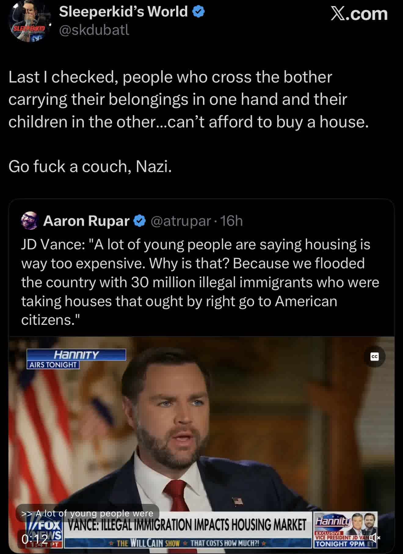 I’m wondering where all of these expensive houses undocumented migrants live in. Of course they’re going to be vacat soon, right, Just Dumb Vance? And because they’re going to be empty, and the population will have dropped what with your genocide deportation policy, the housing is going to be affordable, right?