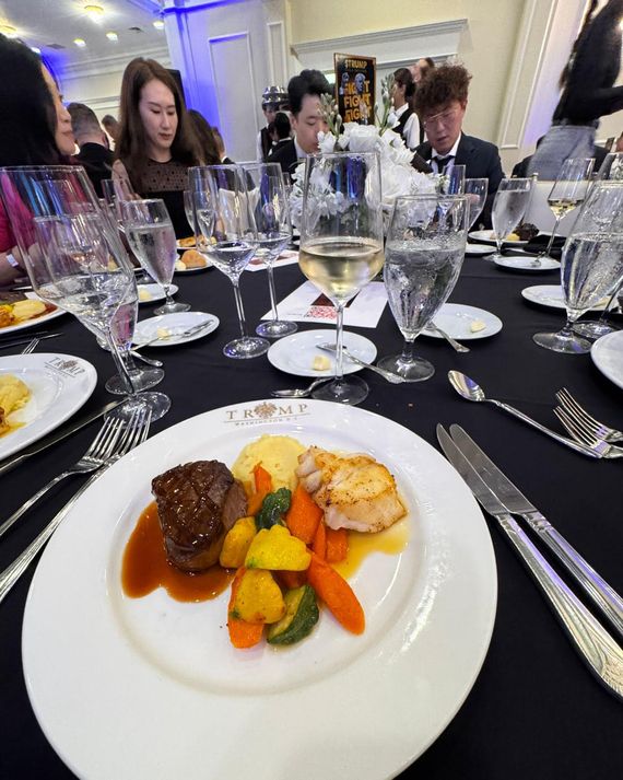 “Trump Organic Field Green Salad” — cucumber, carrot, pickled red onion, and cherry tomato under a honey vinaigrette — followed by pucks of filet mignon and halibut. On the side, they were served a dollop of mashed potatoes and what sure looked like frozen vegetables.