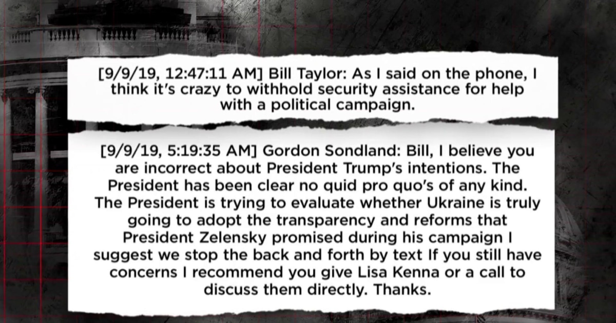 “The one text message that I saw… I don’t even know most of these ambassadors. I didn’t even know their names. But the text message, the text message that I saw, from Ambassador Sondland, who is highly respected, was, there’s no quid pro quo. He said that.” Trump, four days ago.