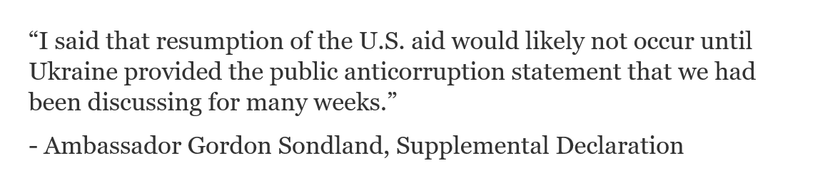 “I said that resumption of the U.S. aid would likely not occur until Ukraine provided the public anticorruption statement that we had been discussing for many weeks.”