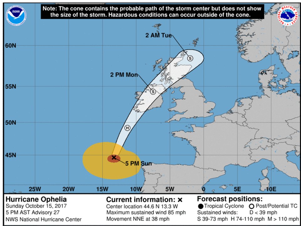 Hurricane Ophelia formed in the eastern Atlantic in a spot where there has never been a hurricane before, and she’s heading towards Ireland and the UK. The US National Weather Bureau’s model map shows a straight line at the point where the storm’s path crosses 60 degrees north, their programs apparently couldn’t imagine a hurricane that far north.