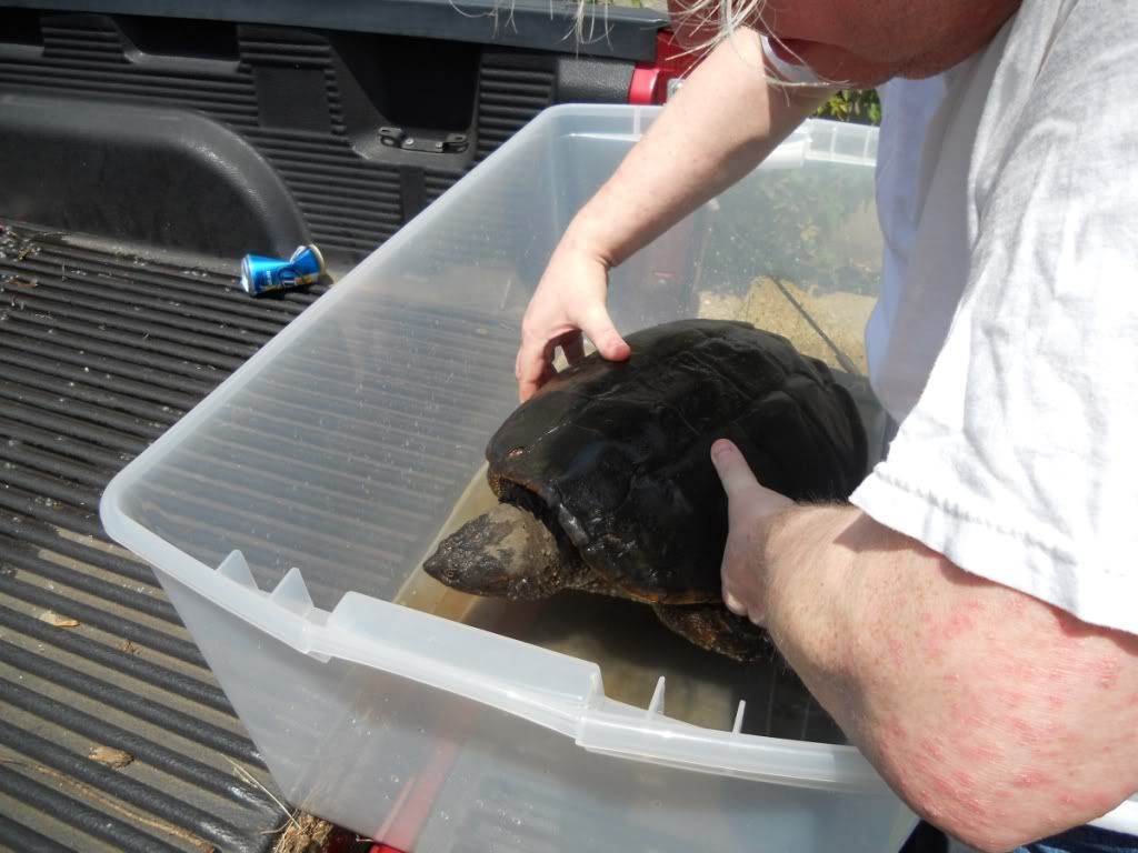 I move turtles from the park road here usually in June when they lay eggs. I pick them up by the side of the shell and hold they with the tail pointing down and slightly away. Otherwise, they will pee all over you.
