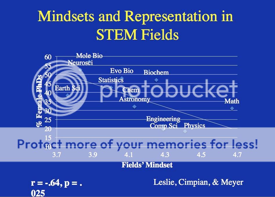As the graph shows (granted it’s very poorly labeled) is that fields in which (1) was a more common response had far fewer female PhD recipients (proportionally) than those that answered (2). And, in fact, the concept of “being smart” can cause smart people to suffer crises and not fulfill their potential as well, because they think they can do anything without trying (and no, I’m not calling you lazy. I take you at your word that you’ve tried and failed many times).