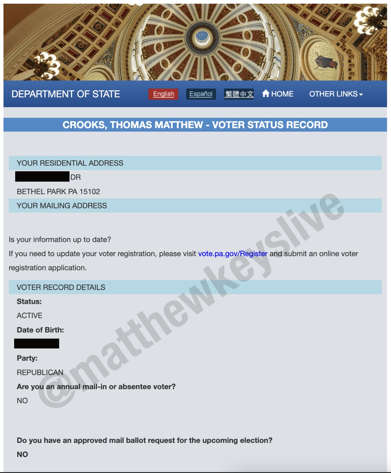 ETA: Found this screenshot but cannot verify just yet, because I need a DOB to look up PA voter registrations and I don’t have Crooks’;