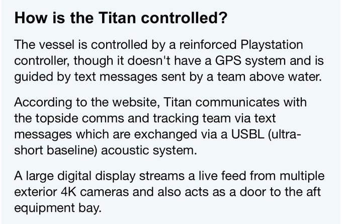 I don’t understand. You complained they were using a playstation controller for computer input. I pointed out they had at least two other computer input devices available, visible in your own photo. Are you saying that you know it was the playstation controller that failed and that the backups didn’t work? I thought no one knew yet why the sub has gone missing. If you have inside intel, please let us know.