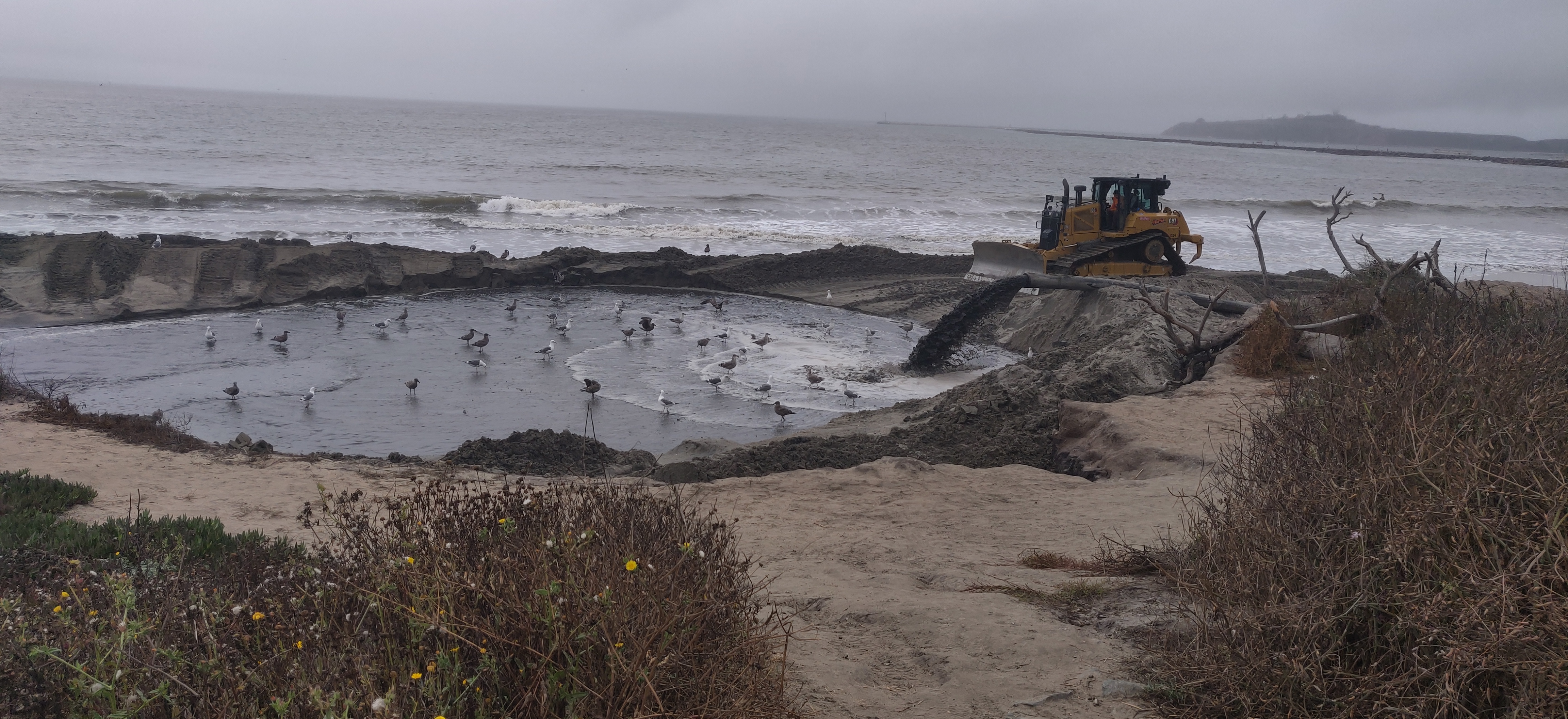 I guess this is in between civilization and nature. There is a project near me to dredge out the harbor and redeposit the sand in an area that has been heavily eroded by ocean currents modified by a several-decades-old breakwater. They have laid two big pipes about 1/4 mile long from the harbor to the deposition site and today have started pumping a slurry of sand and seawater through the pipes. You can see the outflow just below the bulldozer. Also, for some reason a bunch of seabirds have decided the new pool is an awesome place to hang out.