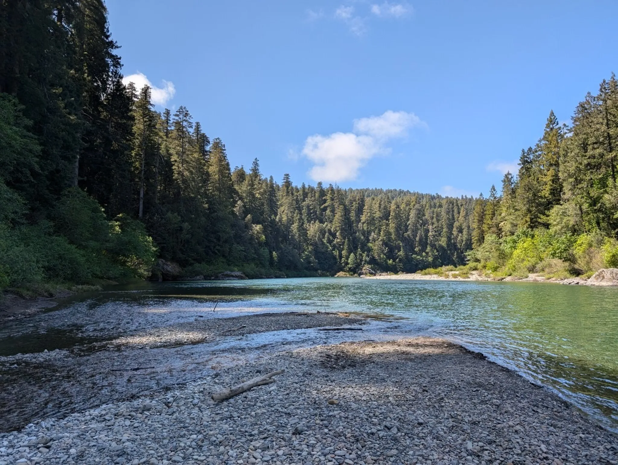 Over the weekend, we had a cool and refreshing splash in the Smith River in Northern California/Southern Oregon. We waded in at Stout Memorial Grove, part of the huge Redwood National & State Parks area (which consists of several parks combined into one). It was a relaxing jaunt amongst big redwoods followed by some of the clearest waters you can find in any US river.